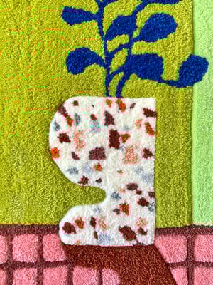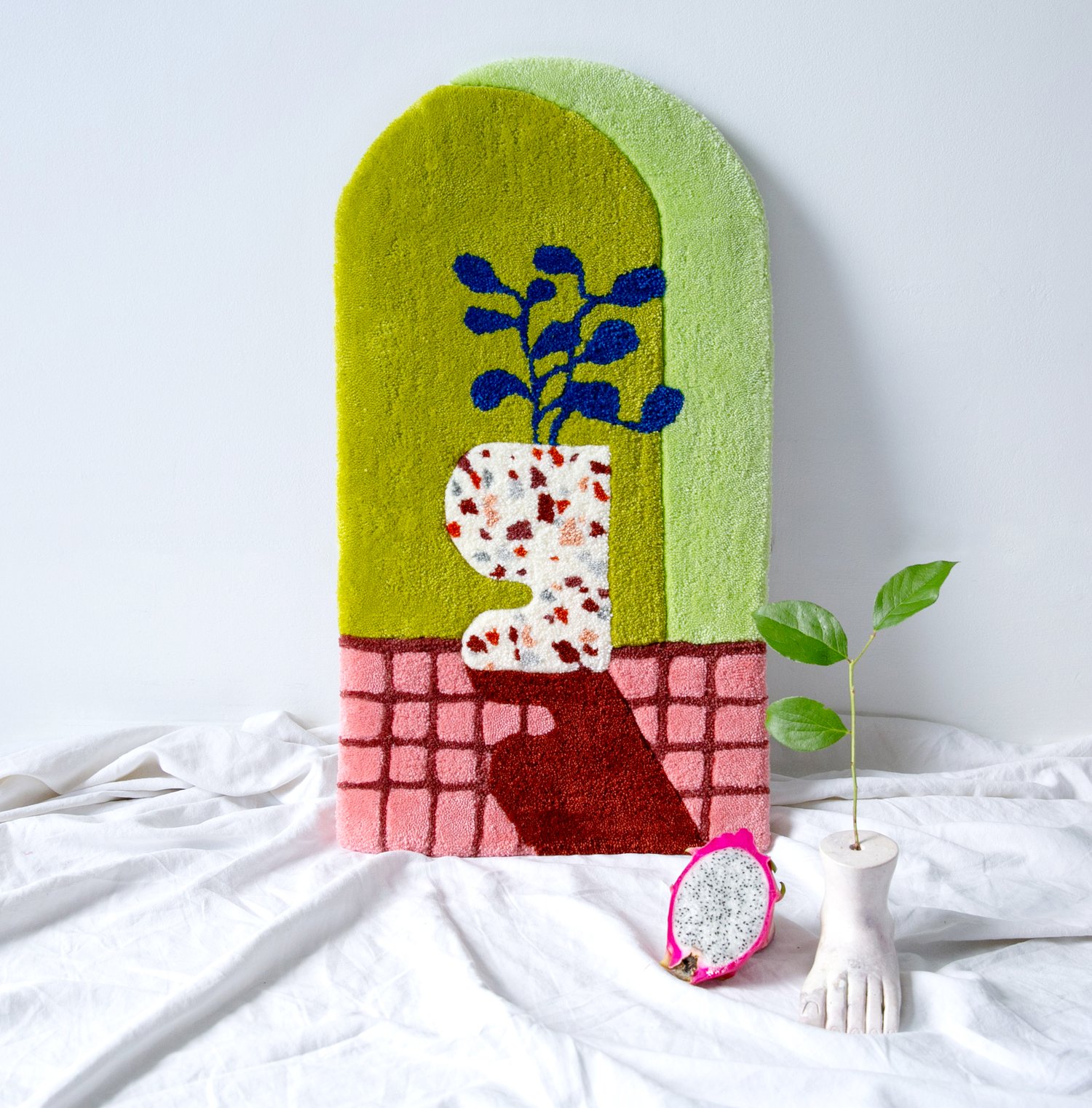 ● Made in acrylic yarn. Carpet glue, tufting cloth, laine felt backing and twill tape.