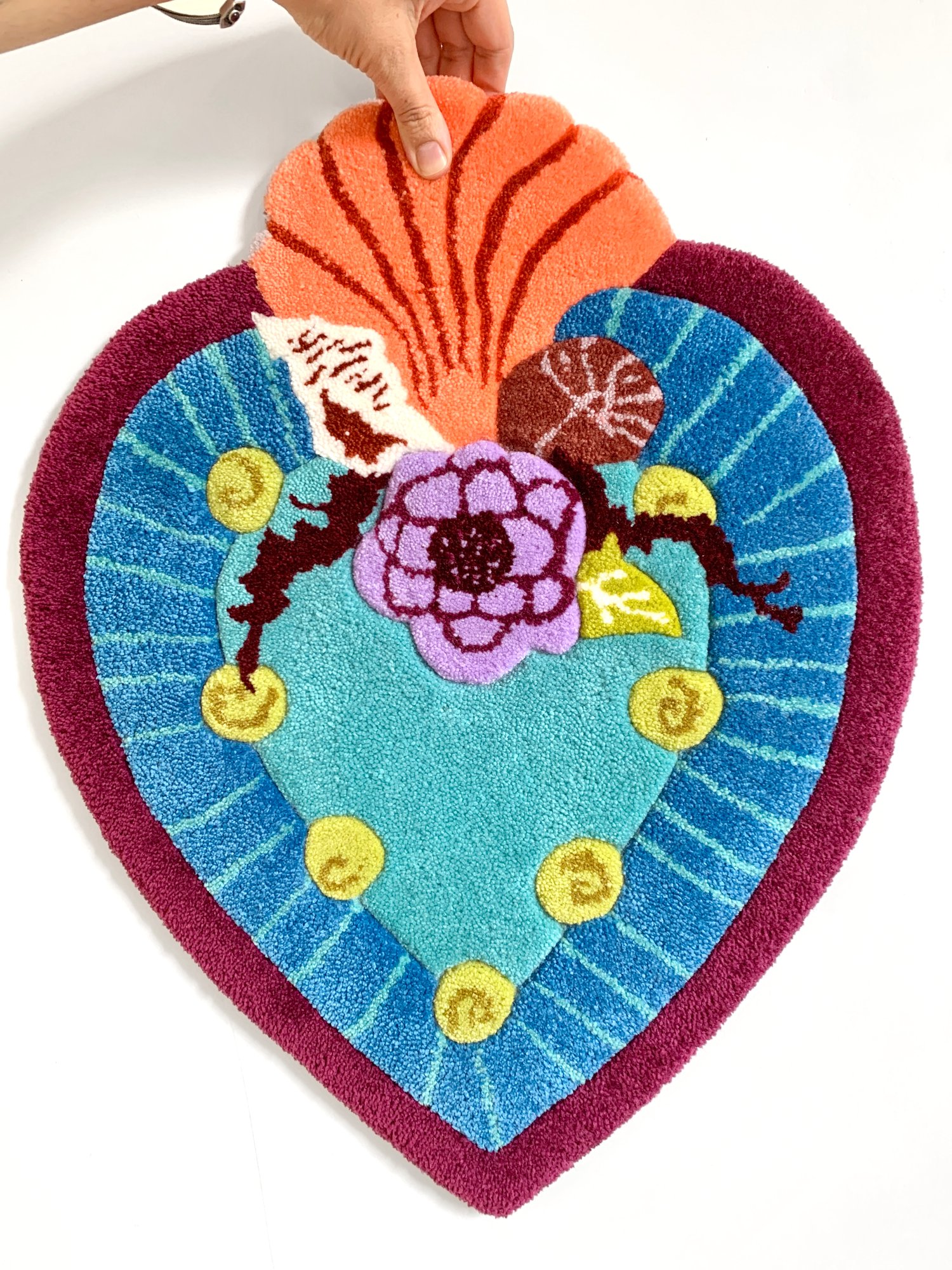 ● Made in a mix of acrylic yarn and 100% natural wool yarn. Carpet glue, tufting cloth, cotton fabric and twill tape.